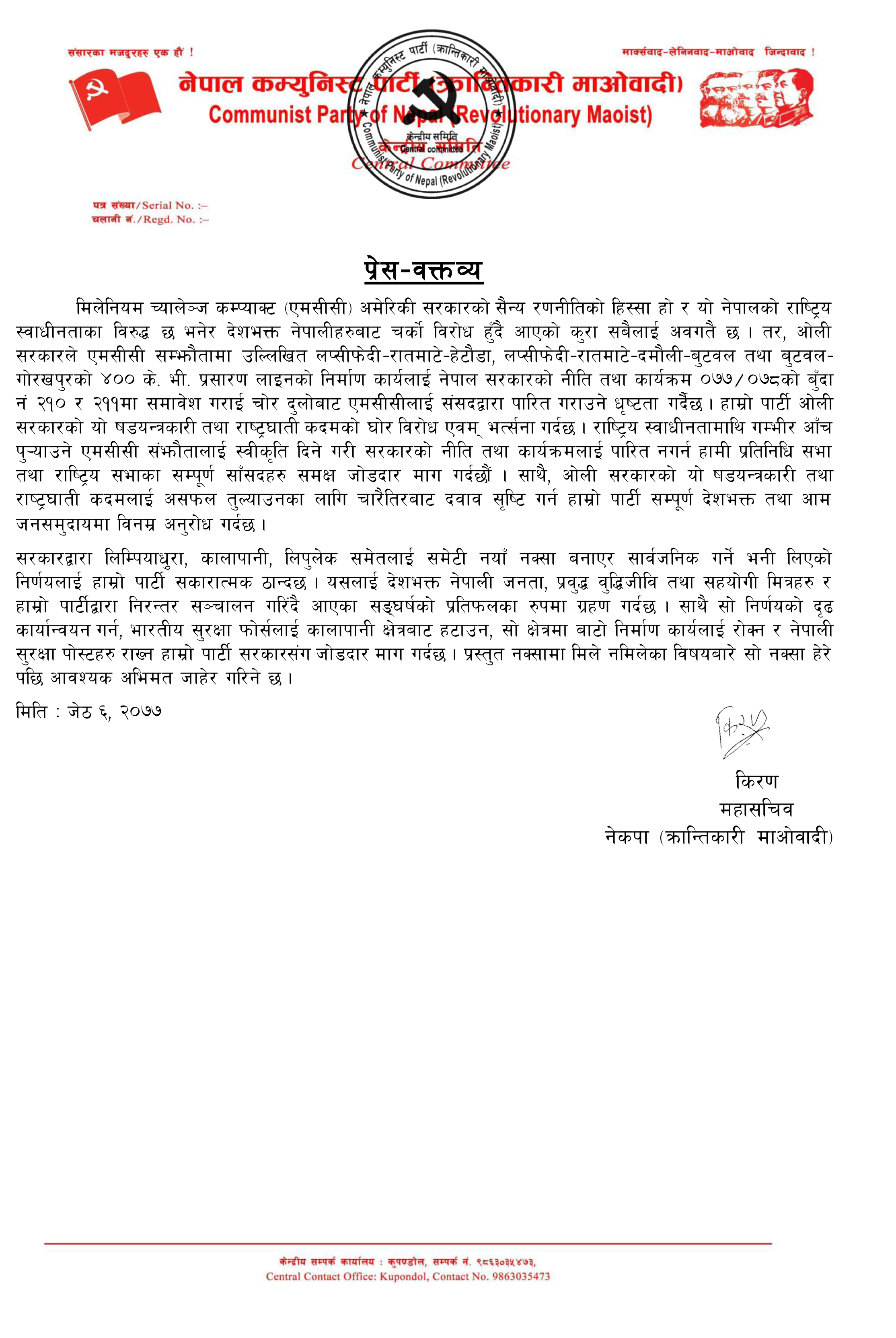 त्यसैगरी महासचिव किरणले जारी गरेको वक्तव्यमा लिम्पियाधुरा, लिपुलेक, कालापानी क्षेत्र समेत समावेश गरी नयाँ नक्सा जारी गर्ने भनि गरेको निर्णयलाई भने सकारात्मक रुपमा लिएको छ । सरकारको यो निर्णयलाई वक्तव्यमा देशभक्त नेपाली जनता, प्रवुद्ध वुद्धिजीवि तथा सहयोगी मित्रहरु र हाम्रो पार्टीद्वारा निरन्तर सञ्चालन गरिंदै आएका सङ्घर्षको प्रतिफलका रुपमा ग्रहण गरिएको छ ।