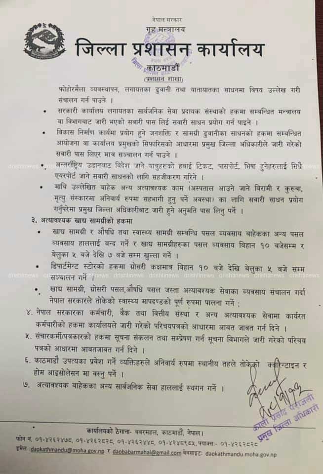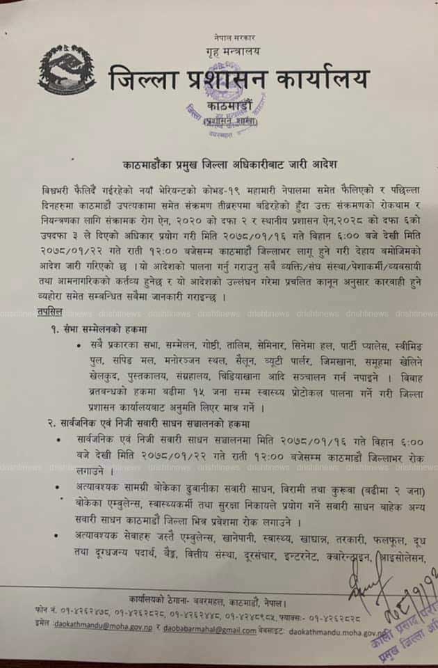काठमाडौंमा प्रमुख जिल्ला अधिकारीले जारी गरेको आदेश अनुसार वैशाख १६ गते बिहान ६ बजेदेखि वैशाख २२ गते राति १२ बजेसम्म अत्यावश्यकबाहेकका सेवा सबै बन्द हुने भएको छ ।