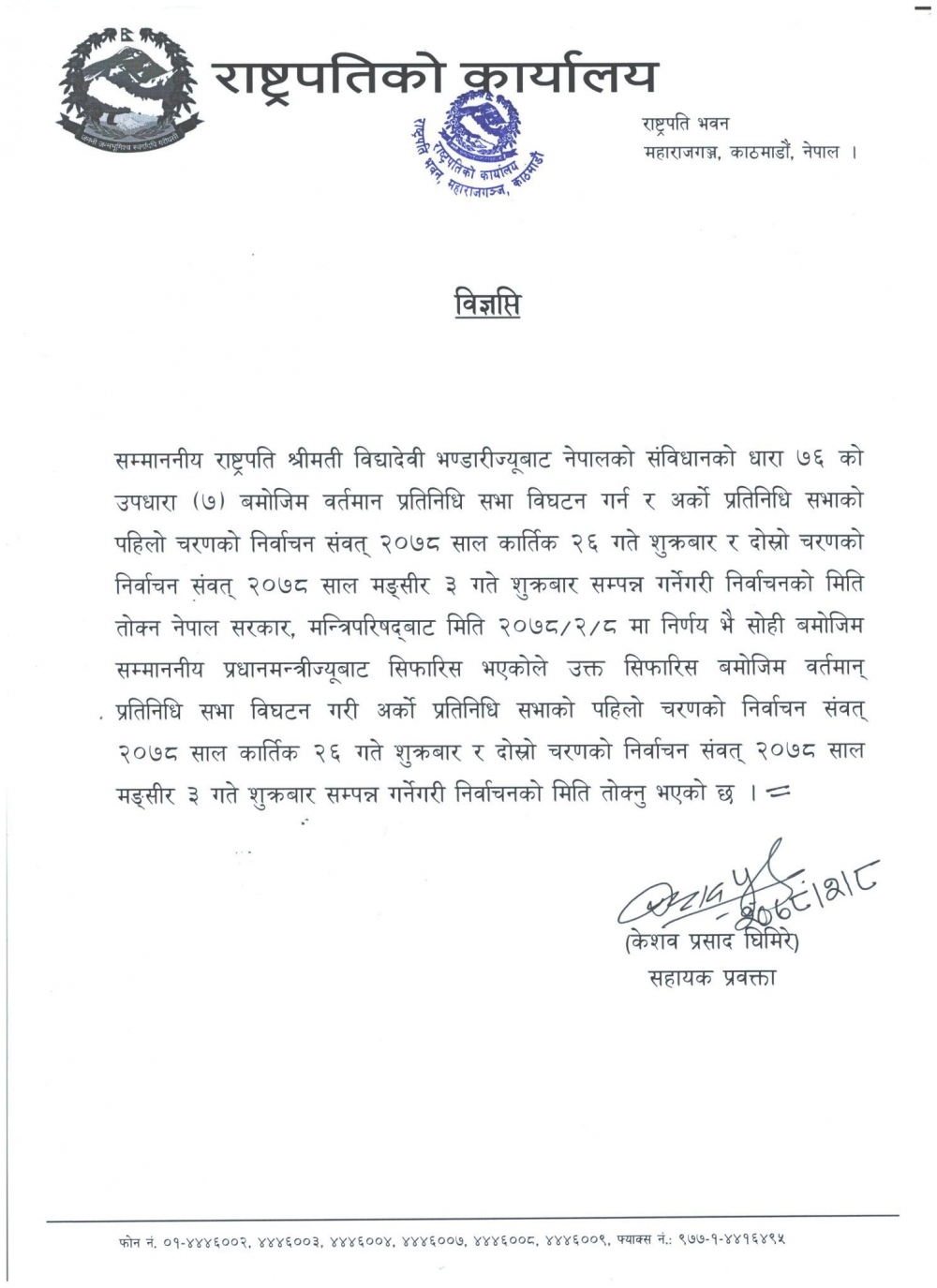 काठमाडौं । ओलीले फेरि प्रतिनिधिसभा संसद भंग गरी मध्यावधि निर्वाचन घोषणा गर्न सिफारिस गरेको छ ।