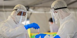 Magen David Adom medical team members, wearing protective gear, are handling a Coronavirus test sample at a drive-through site for Coronavirus testing samples collection, in Tel Aviv, on March 22, 2020. Photo by Flash90 *** Local Caption *** ÷åøåðä