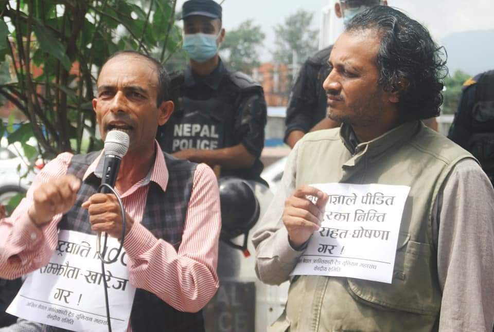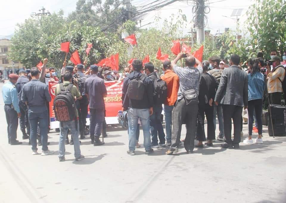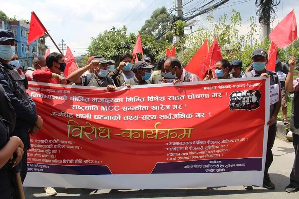 नेकपा (क्रान्तिकारी माओवादी) सम्बद्ध अखिल नेपाल क्रान्तिकारी ट्रेड युनियन महासंघले निषेधाज्ञाले संकटग्रस्त मजदुरलाई विशेष राहत घोषणा गर्नुपर्ने, राष्ट्रघाति एमसिसि सम्झौता खारेज हुनुपर्ने, जयसिंह धामी घटनाको तथ्य-सत्य छानबिन हुनुपर्ने सहितका ११ सुत्रीय माग राखी माइतीघर मण्डलामा विरोध कार्यक्रम सम्पन्न गरेको छ ।