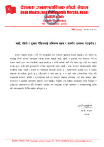 यो पटकको बर्षाले र त्यसबाट उत्पन्न परिस्थितिबाट किसानले धानमा ठूलो क्षति भोगेका छन् । सरकार यो पटकपनि समयमा नै भारी बर्षको सूचना दिन चुकेको छ । यसै सन्दर्भलाई लिएर देजमो अध्यक्ष सीपी गजुरेलव्दारा केन्द्र, प्रदेश र स्थानीय तहका सरकारहरुसँग जोडदार माग गर्दै निम्नलिखित प्रेस बक्तब्य प्रकाशित गरिएको छ :