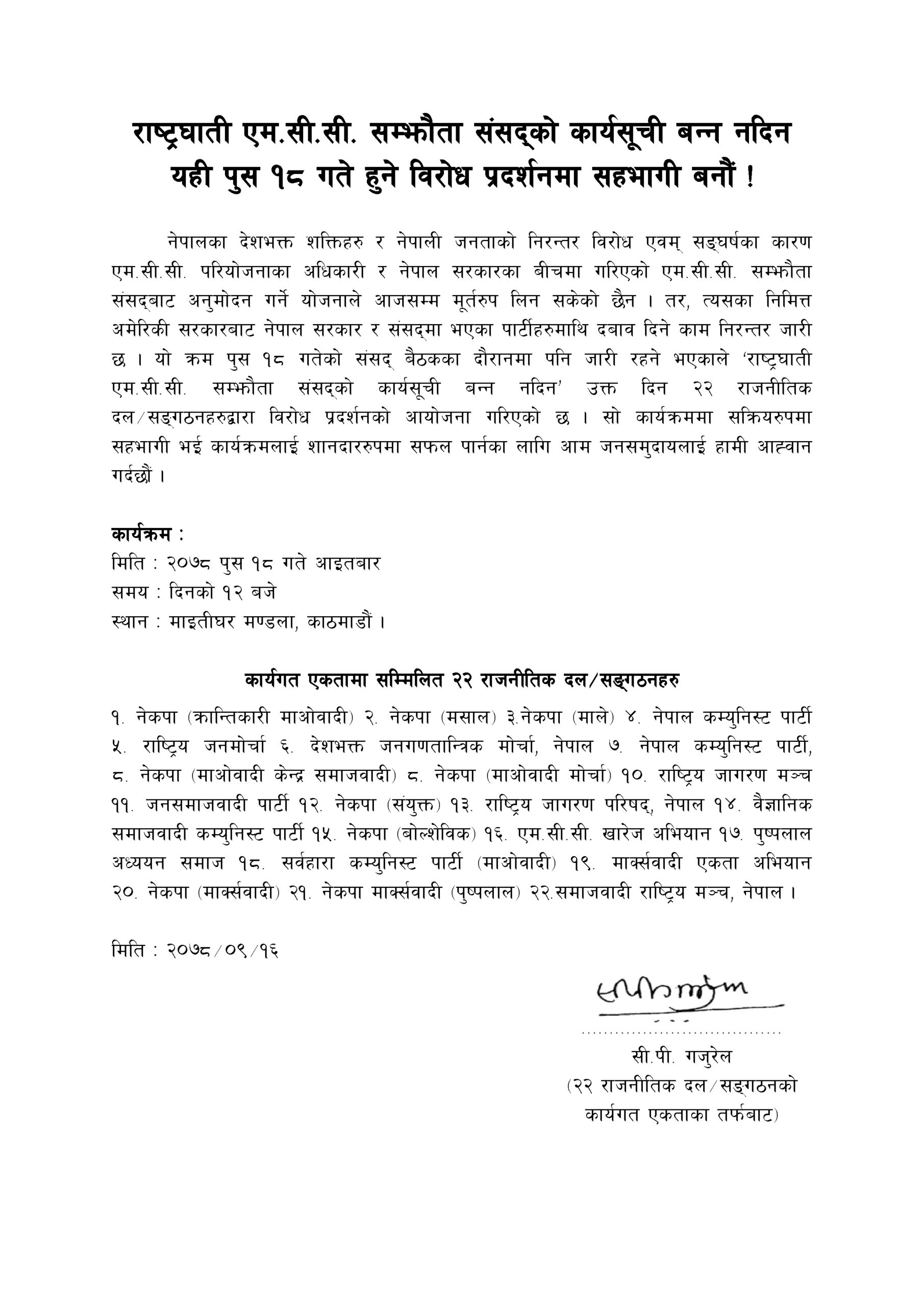 नेपालका देशभक्त शक्तिहरु र नेपाली जनताको निरन्तर विरोध एवम् सङ्घर्षका कारण एम.सी.सी. परियोजनाका अधिकारी र नेपाल सरकारका बीचमा गरिएको एम.सी.सी. सम्झौता संसद्बाट अनुमोदन गर्ने योजनाले आजसम्म मुर्तरुप लिन नसकेकाे उल्लेख गर्दै २२ वटा राजनीतिक संगठनकाे तर्फबाट नेकपा (क्रान्तिकारी माओवादी)का स्थायी समिति सदस्य तथा देशभक्त जनगणतान्त्रिक माेर्चा, नेपालका अध्यक्ष सीपी गजुरेलले जारी गर्नु भएकाे प्रेस वक्तव्यमा अमेरिकी सरकारबाट नेपाल सरकार र