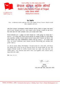 धादिङ्ग जिल्ला गङ्गाजमुना गाउँपालिकाद्धारा सञ्चालित पालिकाको चमेनागृह (क्यान्टिन) मा कुकका रुपमा कार्यरत सुवास बि.कलाई, विश्वकर्मा भएकै कारण जागिरबाट निस्कासन गरिएको जानकारी प्राप्त भएको छ । उक्त घटनाप्रति धादिङ जिल्ला कमिटि संयोजक सुजन रम्तेलव्दारा भत्र्सना गर्दै निम्न प्रेस विज्ञप्ति प्रकाशित गरिएको छ ः