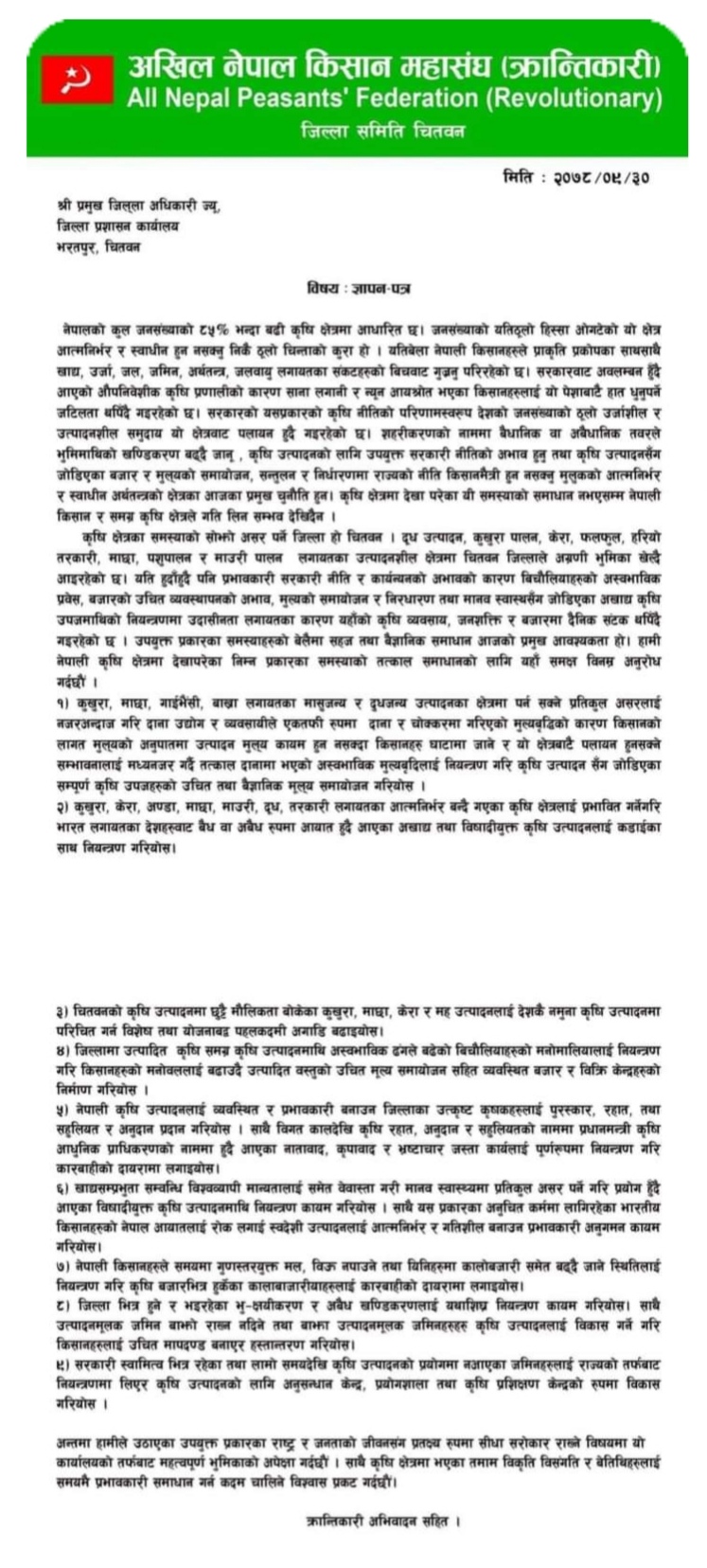 काठमाडौं । अखिल नेपाल किसान महासंघ (क्रान्तिकारी) जिल्ला समिति चितवनले जिल्लाका कृषि समस्याहरुकाे बारेमा प्रमुख जिल्ला अधिकारी(CDO) लाई ज्ञापनपत्र बुझाएको छ ।