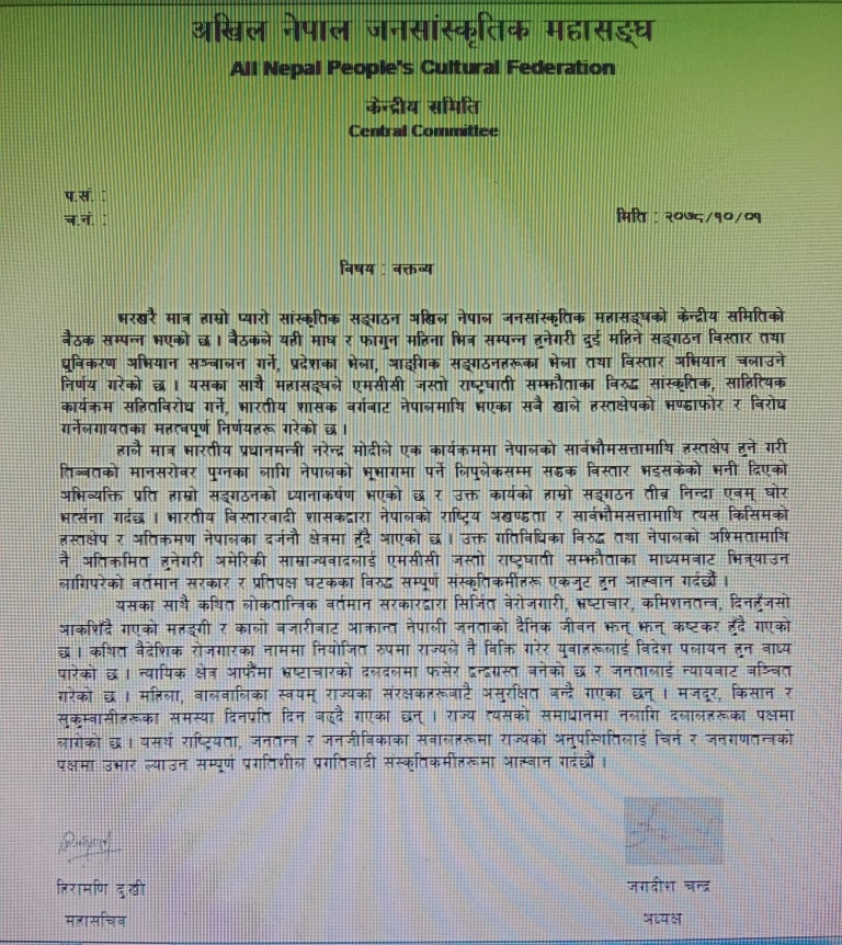 भरखरै मात्र सङ्गठनको केन्द्रीय समितिको बैठकका निणर्यहरूबारे जानकारी गराउन जारी गरिएको वक्तव्यमा नेपालको संसदबाट पारित गर्न र गराउन लागिएको राष्ट्रघाती एमसीसी सम्भौताको पनि कडा रूपमा विरोध गरेको जनाएको छ । उसले यसप्रकारका राष्ट्रघाती सम्झौता तथा नेपालमाथि भइरहेको वैदेशिक हस्तक्षपका विरुछ सम्पूणर् संस्कृतिकर्मीहरू एकजुट भएर विारोधमा उत्रन आह्वान पनि गरेको छ । वक्तव्यमा नेपालमा भइरहेको वर्तमान सरकारद्वारा सिर्जित वेरोजगारी, भ्रष्टाचार, कमिशनतन्त्र, दिनहुँजसो आकशिँदै गएको महङ्गी र कालो बजारीबाट आक्रान्त नेपाली जनताको दैनिक जीवन झन् झन् कष्टकर हुँदै गएको जनाउँदै त्यसका विरुद्ध सशक्त रूपमा प्रतिरोधमा उत्रनुपर्ने जनाएको छ । वक्तव्यको पूणर् पाठ यसप्रकार छ-