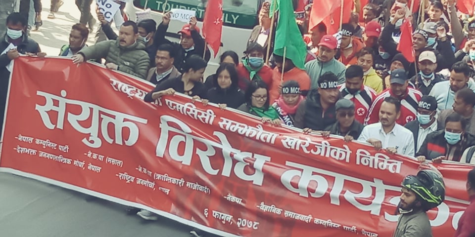 विरोध प्रदर्शनमा एमसीसी चाहिदैन, देश बेच्न पाइदैन, अमेरिकी साम्राज्यवाद मुर्दावाद, दलालहरु होशियार लगायतका नाराहरु घन्काइएका थिए ।