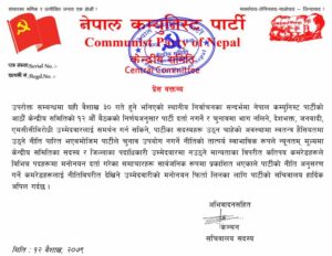 नेपाल कम्युनिस्ट पार्टी केन्द्रीय सचिवालयले पार्टीको निर्णय र नीतिविरुद्ध स्थानीय चुनावमा उम्मेदवार बनेका पार्टी केन्द्रीय सदस्य र जिल्लाका पदाधिकारीलाई अविलम्ब उम्मेदवारी फिर्ता लिन आह्वान गरेको छ ।