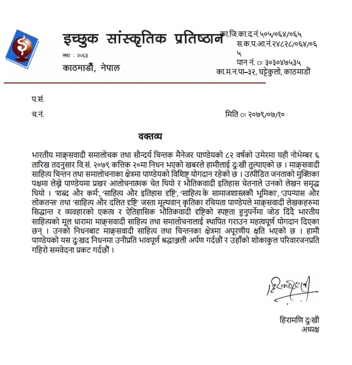 प्रतिष्ठानका अध्यक्ष हिरामणि दुःखीले जारि गरेको वक्तव्यमा भनिएको छ ‘भारतीय माक्र्सवादी समालोचक तथा सौन्दर्य चिन्तक मैनेजर पाण्डेयको ८२ वर्षको उमेरमा यही नोभेम्बर ६ तारिख तदनुसार वि.सं. २०७९ कत्तिक २०मा निधन भएको खबरले हामीलाई दुःखी तुल्याएको छ । माक्र्सवादी साहित्य चिन्तन तथा समालोचनाका क्षेत्रमा पाण्डेयको विशिष्ट योगदान रहेको छ । उत्पीडित जनताको मुक्तिका पक्षमा लेख्ने पाण्डेयमा प्रखर आलोचनात्मक चेत थियो र भौतिकवादी इतिहास चेतनाले उनको लेखन समृद्ध थियो ।’