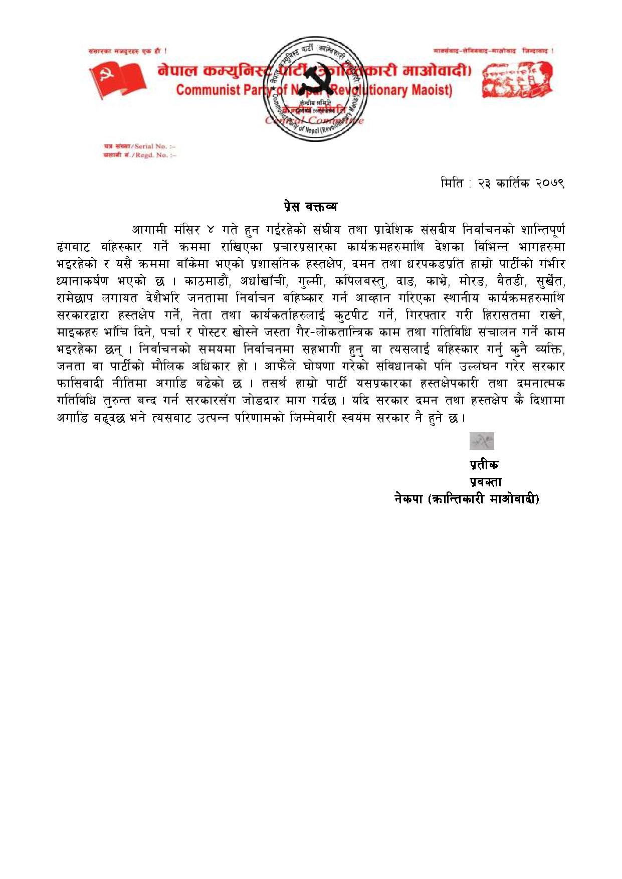 काठमाडौं, अर्धाखाँची, गुल्मी, कपिलबस्तु, दाङ, काभ्रे, मोरङ, बैतडी, सुर्खेत, रामेछाप लगायत देशैभरि जनतामा निर्वाचन बहिष्कार गर्न आव्हान गरिएका स्थानीय कार्यक्रमहरुमाथि सरकारद्वारा हस्तक्षेप गर्ने, नेता तथा कार्यकर्ताहरुलाई कुटपीट गर्ने, गिरफ्तार गरी हिरासतमा राख्ने, माइकहरु भाँचि दिने, पर्चा र पोस्टर खोस्ने जस्ता गैर लोकतान्त्रिक काम तथा गतिविधि संचालन गर्ने काम भइरहेका छन् । निर्वाचनको समयमा निर्वाचनमा सहभागी हुनु वा त्यसलाई बहिष्कार गर्नु कुनै व्यक्ति, जनता वा पार्टीको मौलिक अधिकार हो । आफैंले घोषणा गरेको संविधानको पनि उल्लंघन गरेर सरकार फासिवादी नीतिमा अगाडि बढेको छ । तसर्थ हाम्रो पार्टी यसप्रकारका हस्तक्षेपकारी तथा दमनात्मक गतिविधि तुरुन्त बन्द गर्न सरकारसँग जोडदार माग गर्दछ । यदि सरकार दमन तथा हस्तक्षेप कै दिशामा अगाडि बढ्दछ भने त्यसबाट उत्पन्न परिणामको जिम्मेवारी स्वयंम सरकार नै हुने छ । ”