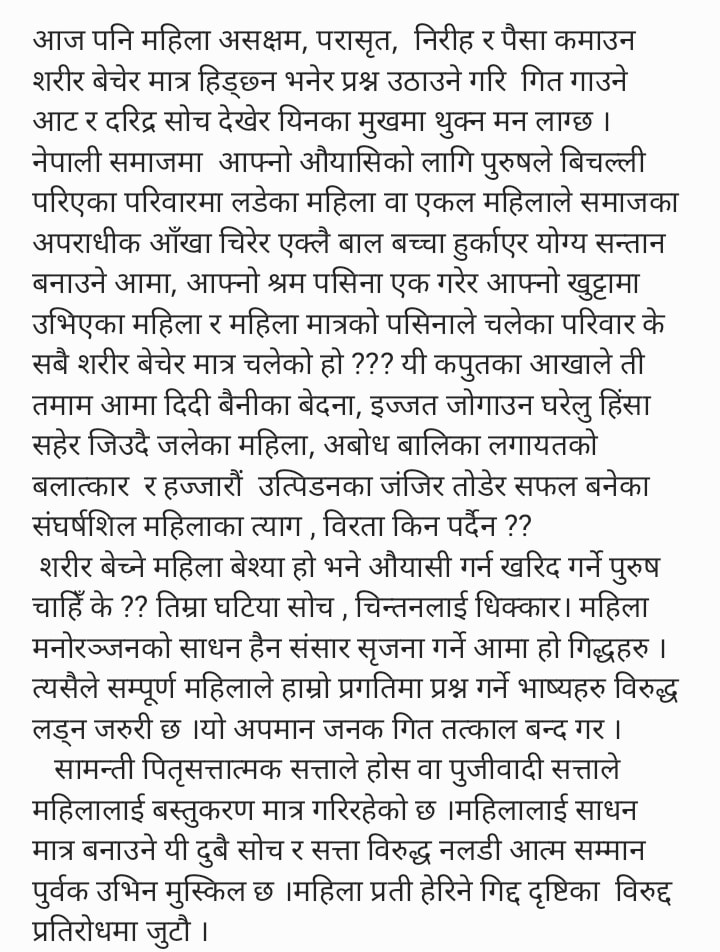 उहाँले सामाजिक सञ्जालमा लेख्नुभएको छ, “महिला मनोरञ्जनको साधन होइन, संसार सिर्जना गर्ने आमा हो गिद्दहरु ! त्यसैले सम्पूर्ण महिलाहरुले हाम्रो प्रगतिमा प्रश्न गर्ने गलत भाष्यका विरुद्ध लड्न जरुरी छ । यो अपमानजनक गीत तत्काल बन्द गर ।”