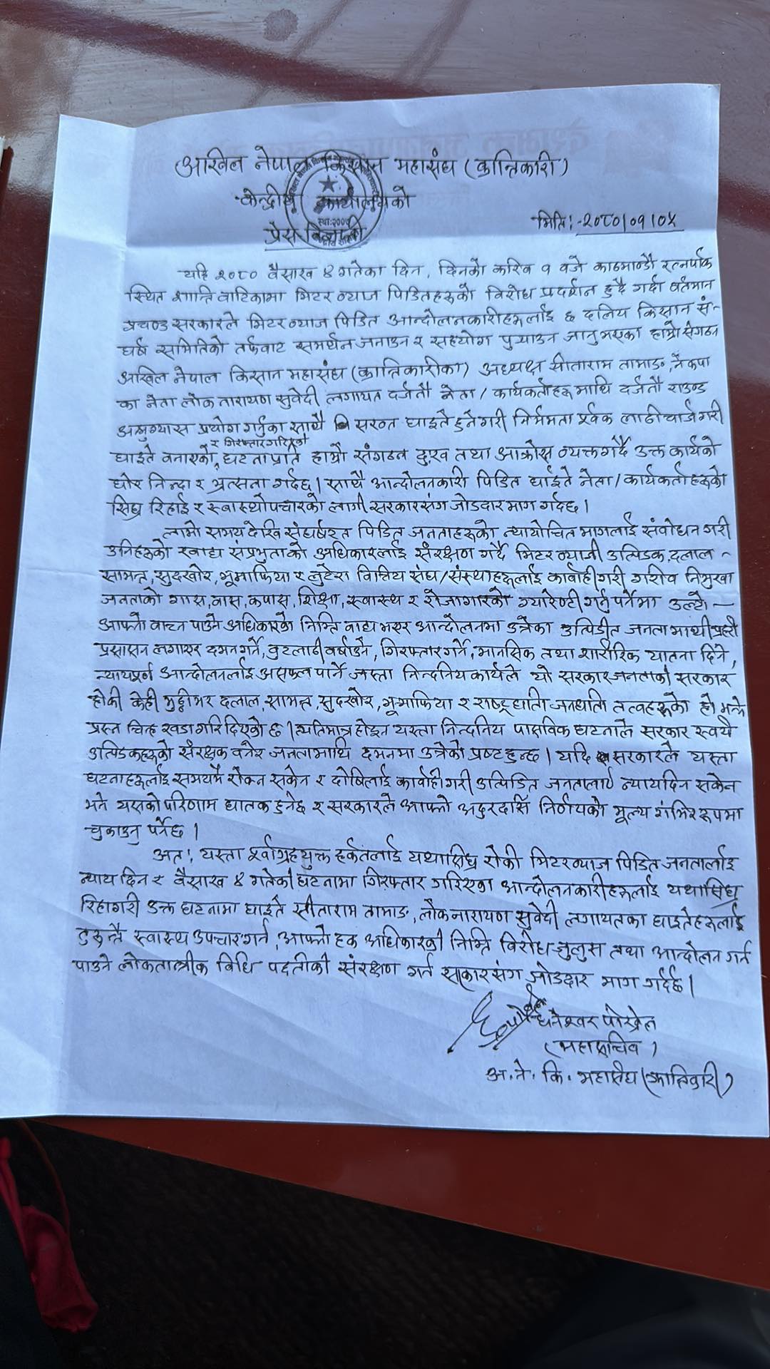 अखिल नेपाल किसान महासंघ (क्रान्तिकारी)का महासचिव धनेश्वर पोखरलेलले जारी गरेको वक्तव्यमा मिटरब्याज पीडित जनतालाई न्याय दिन र बैशाख ४ गतेको घटनामा गिरफ्तार गरिएका आन्दोलनकारीहरुलाई यथासिघ्र रिहागरी उक्त घटनमा घाइते सीताराम तामाङ, लोक नारायण सुवेदी तगायतका घाइतेहरुलाई तुरुन्तै स्वास्थ्य उपचार गर्न, आफ्नो हक अधिकारको निम्ति विरोध जुलुस तथा आन्दोलन गर्न पाउने लाकतान्त्रिक विधि पद्दतिको संरक्षण गर्न सरकारसंग जोडदार माग गरिएको छ ।