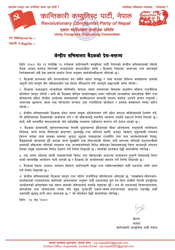 जेष्ठ १८, काठमाडौं । क्रान्तिकारी कम्युनिस्ट पार्टी, नेपालका अध्यक्ष मोहन वैद्य किरणले प्रेस वक्तव्यमार्फत् हालै सम्पन्न पार्टीको केन्द्रीय सचिवालय बैठकले लिएका निर्णयहरु सार्वजनिक गर्नुभएको छ । २८ जेठमा जारी प्रेस वक्तव्यमार्फत् २०८० जेठ २३ गतेदेखि २६ गतेसम्म क्रान्तिकारी कम्युनिष्ट पार्टी नेपालको केन्द्रीय सचिवालयको पहिलो बैठकमा लिइएका आवश्यक तथा महत्वपूर्ण निर्णयहरू सार्वजनिक गर्नुभएको हो ।