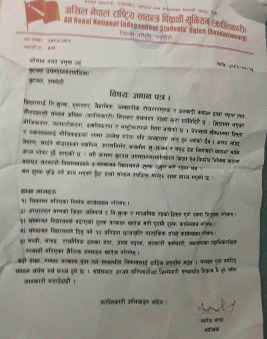 अखिल (क्रान्तिकारी ) रुपन्देहीले नगर प्रमुख खेलराज पाण्डेलाई ज्ञापन पत्र बुझाएको हो । सरकारी तथा संस्थागत शैक्षिक संस्थाले नियम विपरीत विद्यार्थी अभिभावकको ढाड सेक्ने गरि चर्को शुल्क असुल गरेकोलगायत माग राख्दै ज्ञापनपत्र बुझाएको जिल्ला संयोजक मनोज थापाले जानकारी दिनुभयो ।