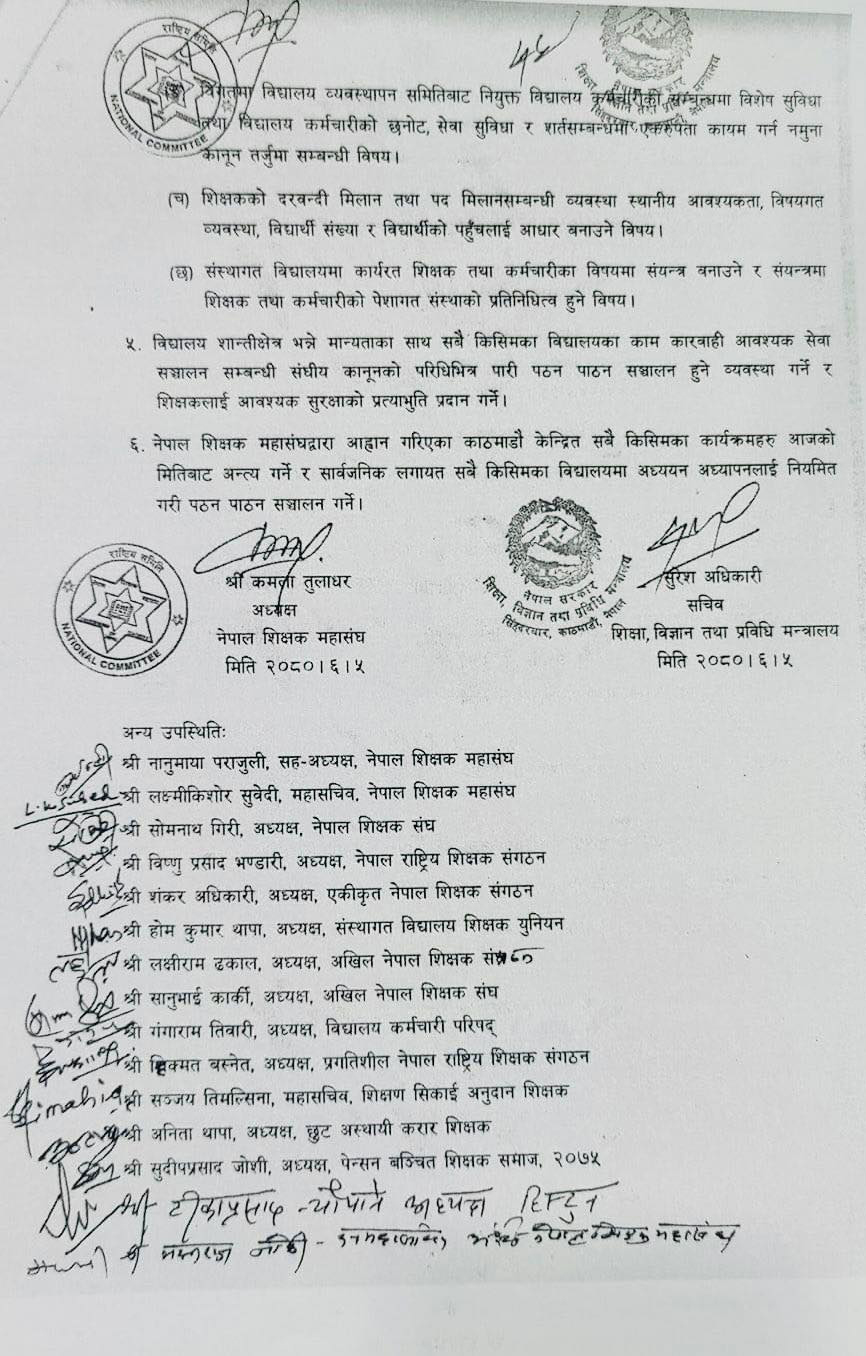 यसैबीच, सरकार र आन्दोलनरत शिक्षक महासंघबीच शुक्रबारै बेलुका ६ बुँदे सहमति भएको छ । र, जारी आन्दोलन फिर्ता लिइएको छ । संसदमा दर्ता भएको विद्यालय शिक्षक विधेयक संशोधन गरी यसको नियमावलीमा समावेश गर्ने विषयहरुमा सहमति जुटेको हो ।