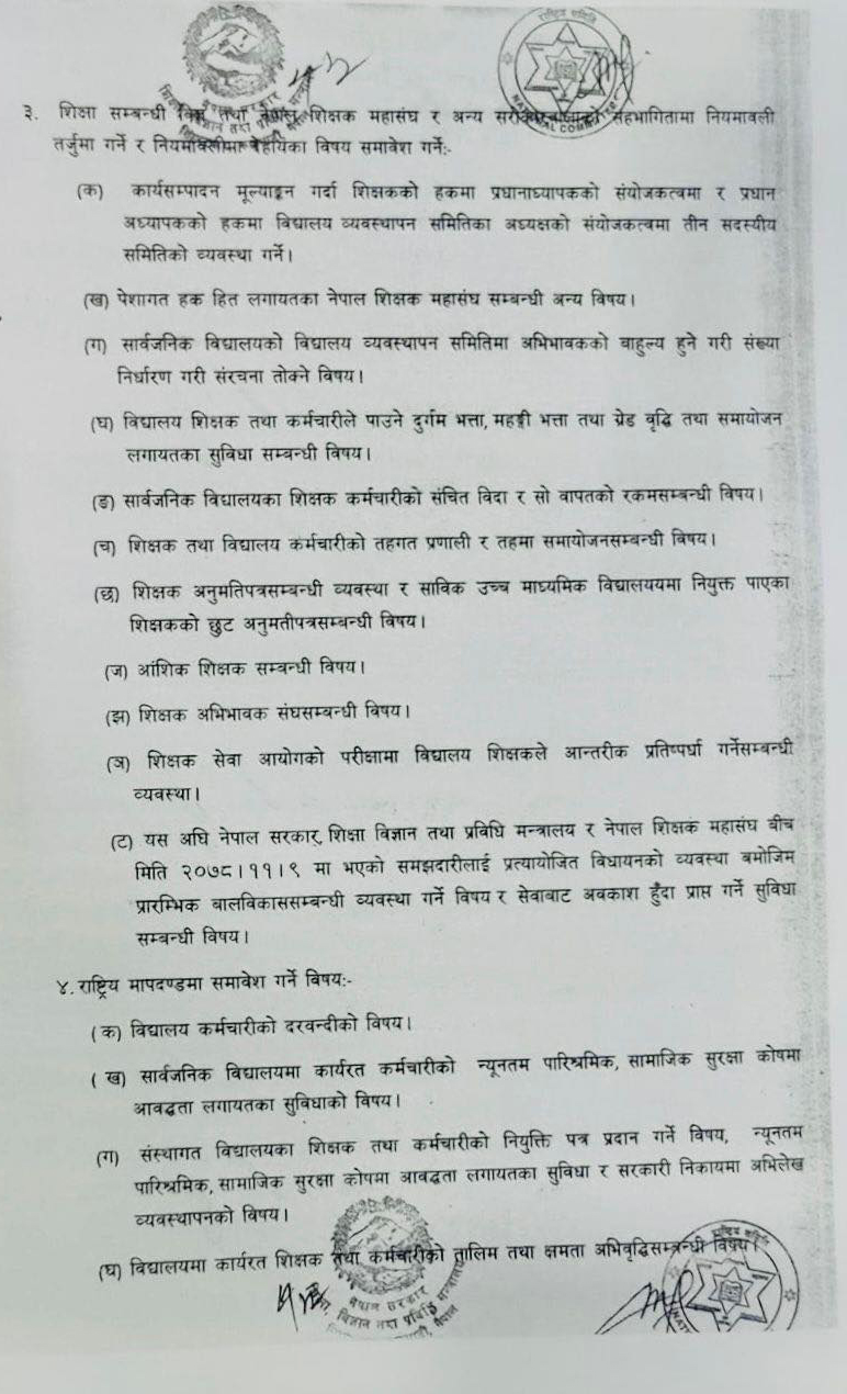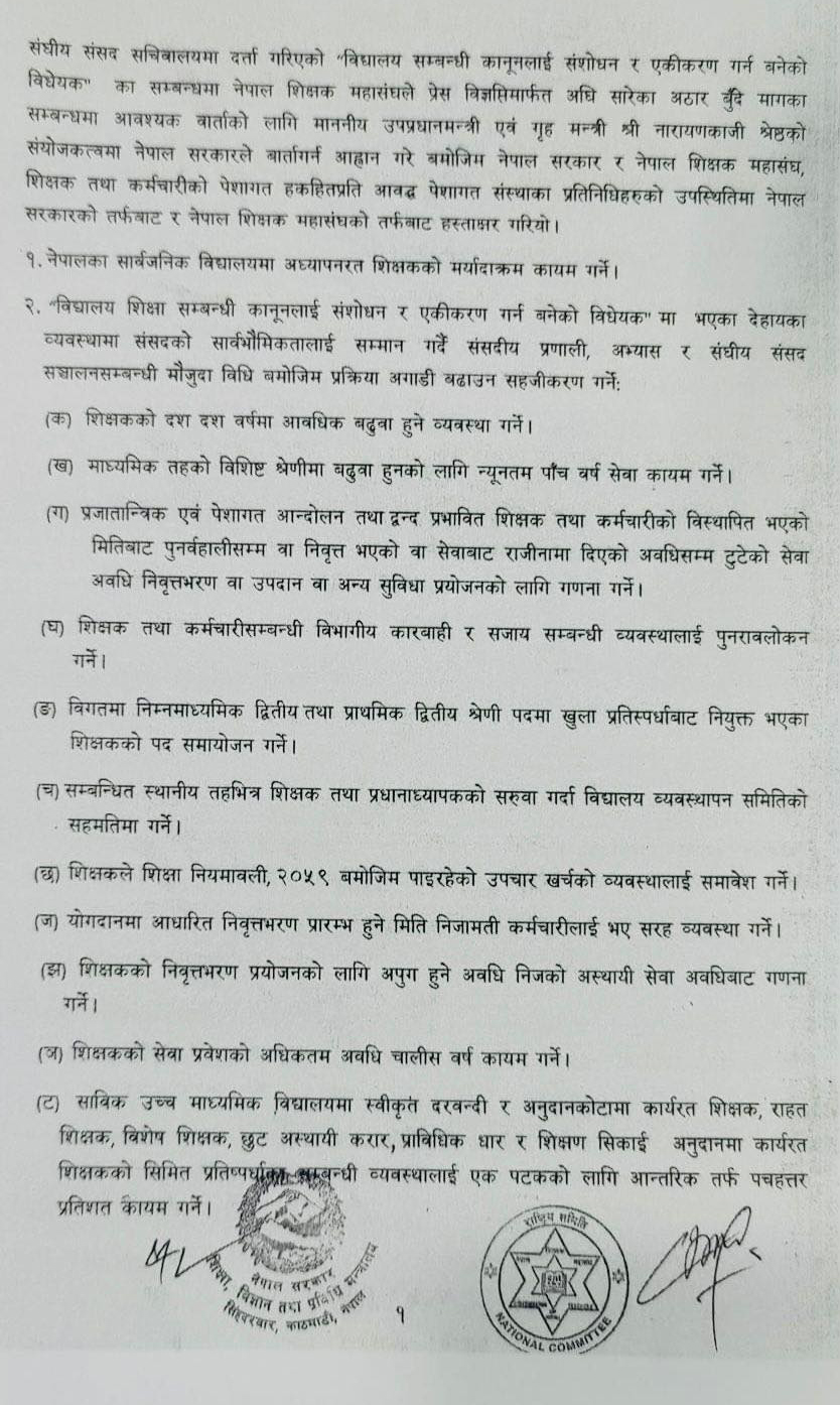 यसबाहेक सार्वजनिक विद्यालयमा अध्यापनरत शिक्षकको मर्यादाक्रम कायम गर्ने, शिक्षा नियमावलीअनुसार पाइरहेको उपचार खर्चसम्बन्धी व्यवस्थालाई विधेयकमा समेट्ने पनि सहमति भएको छ ।