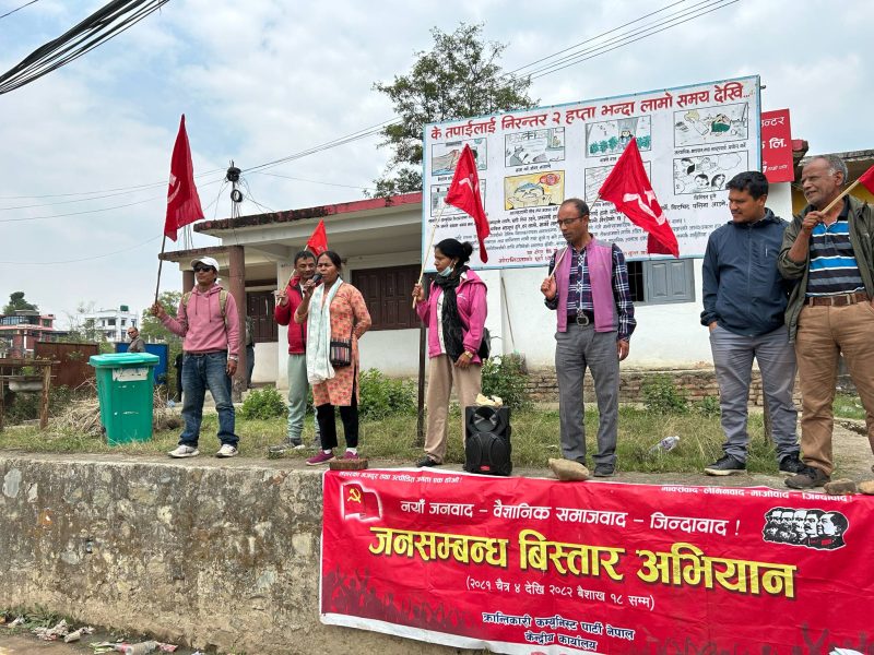 काठमाडौं । क्रान्तिकारी कम्युनिस्ट पार्टी नेपालको केन्द्रबाट गठित जनसम्बन्ध विस्तार अभियान टोलीमध्ये पार्टीका स्थायी समिति सदस्य रामसिंह श्रीस नेतृत्वको १ नं. अभियान टोलीले आज ललितपुरका चार स्थानमा कोणसभा सम्पन्न गरेको छ । ललितपुरको लेलेमा गरिएको कोणसभालाई पार्टीको पीवीएम चन्द्रहरि सुवेदी अटलले गर्नुभएको थियो भने सञ्चालन ललितपुरको सेक्रेटरी जगदिश्वर महर्जनले गर्नुभएको थियो ।