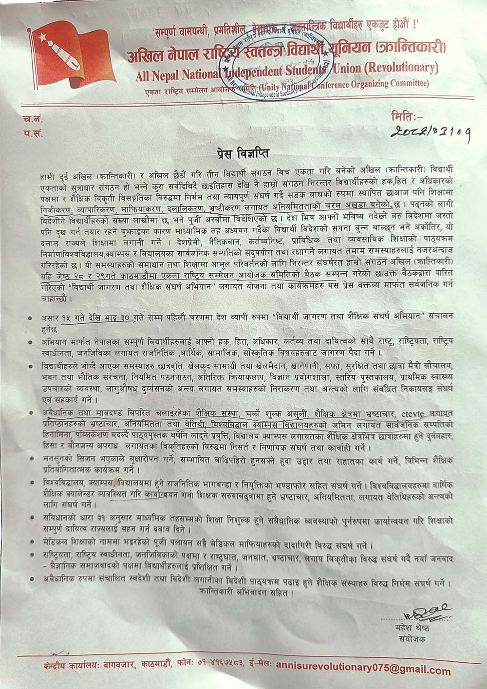 कार्यालय सदस्य नेत्र शाहीले देशमा शिक्षा क्षेत्रमा भ्रष्ट र दलालहरुको विगविगी बढेकाले त्यसको अन्त्य गर्न आफूहरुले उनिहरुविरुद्ध कडा संघर्ष गर्ने चेतावनी दिए । कार्यालय सदस्य सोभा सेन्चुरीले प्रेस विज्ञप्ति वाचन गर्दै १० बुँदे ‘विद्यार्थी जागरण तथा शैक्षीक संघर्षको अभियान’को बारेमा जानकारी दिइन् ।