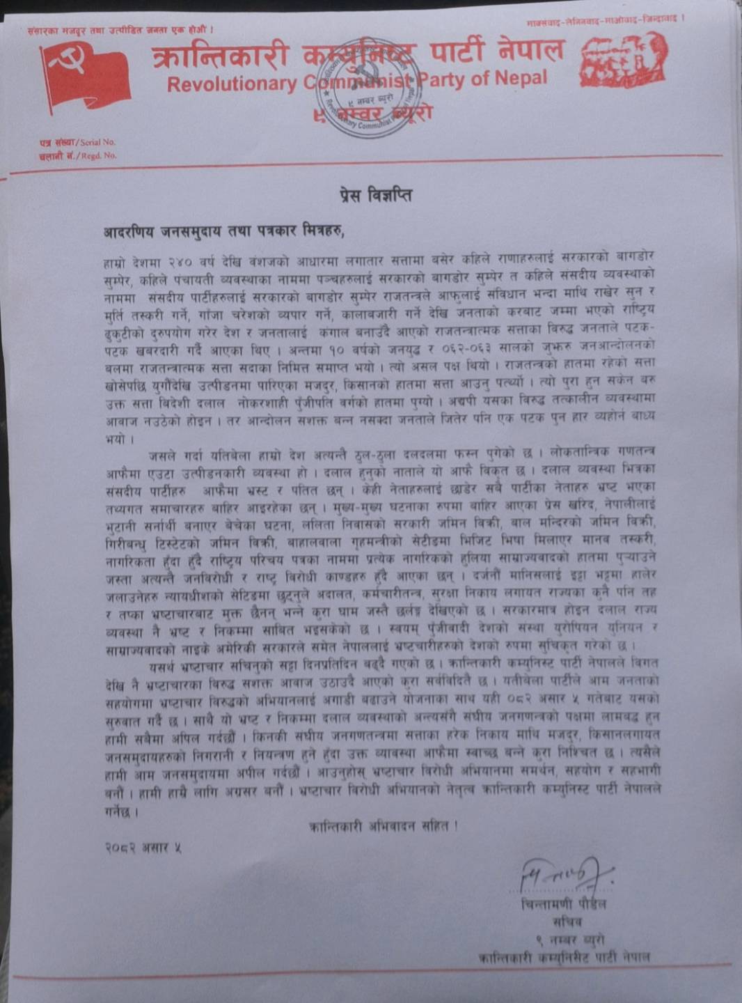 भ्रष्टाचार विरोधी अभियान किन ? भन्ने विषयमा हालै जारी गरेको अपिलमा क्रान्तिकारी कम्युनिस्ट पार्टी नेपालले भनेको छ, “हाम्रो देश भ्रष्टाचारबाट आक्रान्त भएको छ । देशमा भ्रष्टाचार नभएको र नहुने कुनै निकाय छैन । मन्त्रालय, प्रशासनिक तथा स्थानीय निकायहरू, अड्डा अदालत, प्रहरी प्रशासन, विकास निर्माणका काम जहाँ जाउँ त्यहाँ भ्रष्टाचार छ, घुसखोरी ब्याप्त छ । घुस नदिँदासम्म जनताले सामान्य एउटा सिफारिस पनि पाउँदैनन् । यसलाई नियन्त्रण गर्ने निकाय देशको सरकार हो । तर स्वयम् सरकार नै भ्रष्टाचारमा संलग्न रहँदै आएको छ । सरकारमा सामेल भएका मात्र होइन, केही अपवाद बाहेक प्रतिपक्षमा रहेका राजनीतिक पार्टीका नेताहरु समेत भ्रष्टाचारबाट मुक्त छैनन् । भुटानीकरण काण्ड, ललिता निवास काण्ड, सहकारी ठगी काण्ड, गिरीबन्धु टिस्टेट काण्ड, भिजिट भिसा काण्ड लगायत दर्जनौं काण्डहरूले यही कुराको पुष्टि गर्दछन् । यतिसम्म कि भ्रष्टाचार गर्न र त्यसबाट प्राप्त रकम बाँडफाँड गर्न सफ्टवेयर समेत विकास गरिएको कुरा चर्चामा आइरहेको छ ।”