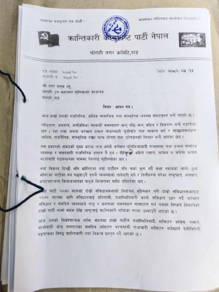 पार्टीका केन्द्रीय सदस्य नवीन खडका ,दिपक बिष्ट , जिल्ला सचिब इश्वरी प्रसाद गैरे , क्रान्तिकारी युवा संघ अध्यक्ष बिरेन्द्र,गोपाल बैद्द, ईश्वरीप्रसाद पाण्डे, बामदेब पोख्रेल ,रमेश महर , हिमाल डि।सि।, गोबिन्द रसायली, गगन खडका, पूर्ण बहादुर खडका ,बिष्णु प्रसाद पोख्रेल, बालाराम कालाथोकी , हुपमान राना , उदय भण्डारी , लगायत नेता तथा कार्यकर्ताहरुको प्रतिनिधि मण्डलले नगर प्रमुखलाई ज्ञापन – पत्र बुझाएको हो ।