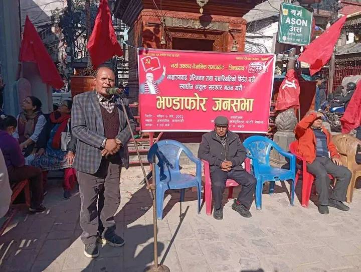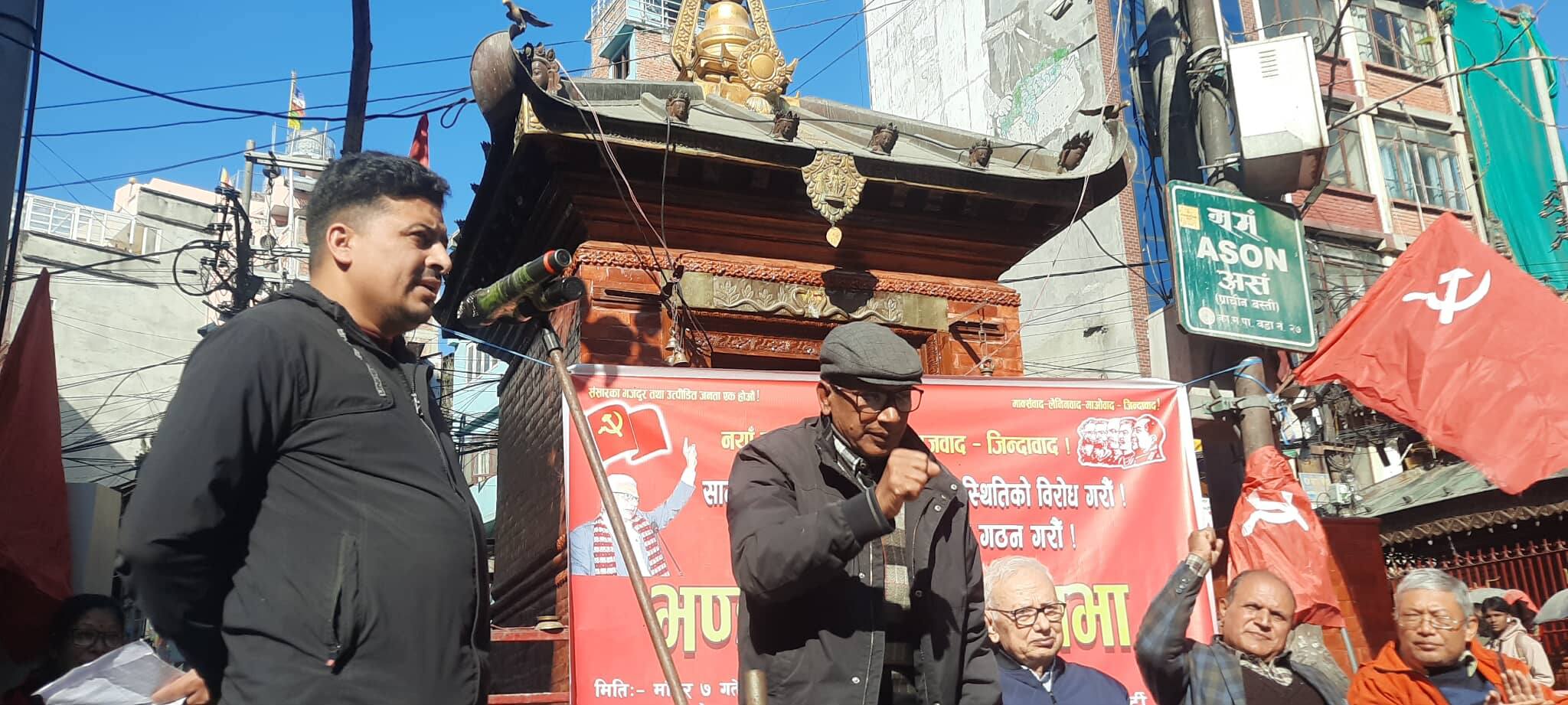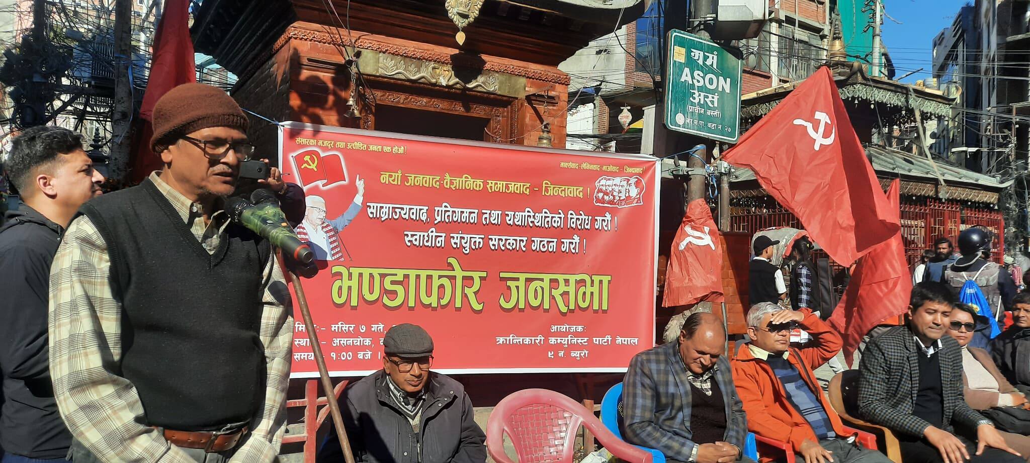 काठमाडौं । क्रान्तिकारी कम्युनिस्ट पार्टी नेपालका महासचिव सीपी गजुरेल गौरवको प्रमुख आतिथ्यतामा काठमाडौंको असन चोकमा जनसभा सम्पन्न गरिएको छ । पार्टीको ९ नं. ब्यूरोको आयोजनामा सम्पन्न जनसभालाई पार्टी महासचिव सीपी गजुरेल गौरव, पोलिटब्यूरो सदस्य तथा ९ नं. ब्यूरोका इन्चार्ज दिनेश शर्मा सागर, पोलिट ब्यूरो सदस्य पवनमान श्रेष्ठ, अधिवक्ता फडिन्द्र कार्की, मजदुर नेतृ कमला चन्द लगायतका नेताहरुले सम्बोधन गर्नुभएको थियो ।