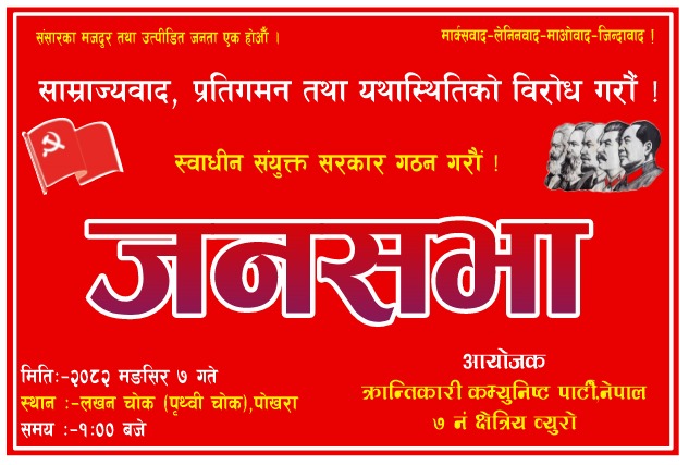 स्वाधीन संयुक्त सरकार गठन गरौं ! भन्ने माग राखि देशभरका मुख्य १६ वटा सहर महेन्द्र नगर,धनगढी,सुर्खेत,घोराही,बुटवल,बाग्लुङ्गबजार,पोखरा,भरतपुर,विदुर,काठमाडौं,धुलिखेल,बिरगञ्जआदिमा एकैपटक जनसभा कार्यक्रमगर्ने क्रममा पोखराको लखन चोक’पृथ्वी चोक‘मा पनि एक जनसभा कार्यक्रम सम्पन्न भएको छ ।
