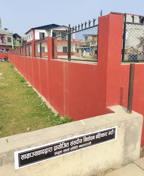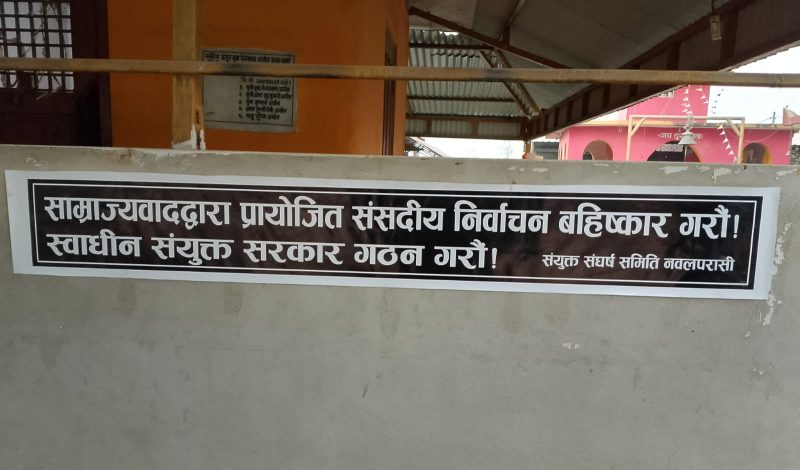 नवलपरासी २९ माघ – जनयुद्ध दिवसको पुर्ब सन्ध्यामा संयुक्त संर्घष समिति नवलपरासी अन्तगरत बिभिन्न बहिष्कारवादी पार्टीहरुले बर्दघाट बजारको चोकचोकमा कालो ब्यानर लगाएर निर्वाचनको बिरोध गरेका छन् । निर्वाचन बहिष्कारको पक्षमा प्रचार प्रसार तीब्र बनाउदै संयुक्त संघर्ष समिति सम्बद्व पार्टीहरुले समितिको संयुक्त र पार्टीको एकल कालो ब्यानर लगाउदै निर्वाचनको बिरोध गरेका हुन ।