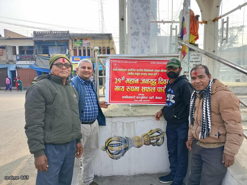 नवलपरासी १ फागुन – क्रान्तिकारी कम्युनिष्ट पार्टी नेपाल नवलपरासीले ३१ औं जनयुद्ध दिवसको अवसरमा शुभकामना आदान प्रदान कार्यक्रम बर्दघाट–४ दिब्यनगरमा सम्पन्न गरेको छ । कार्यक्रममा पार्टीका बैकल्पिक केन्द्रीय सदस्य तथा जिल्ला सेक्रेटरी रवि पाण्डेय, क्रान्तिकारी संयुक्त मोर्चा नेपालका जिल्ला संयोजक चुडामणी भण्डारीले शुभकामना मन्तब्य राख्दै साम्राज्यवादद्वारा प्रायोजित निर्वाचनलाई सशक्त रुपमा बहिष्कार गरेर मात्र जनयुद्ध प्रति न्याय हुने चर्चा गरे । कार्यक्रमको संचालन पार्टीका जिल्ला कार्यालय सदस्य गणेश बहादुर ढकालले गरेका थिए ।