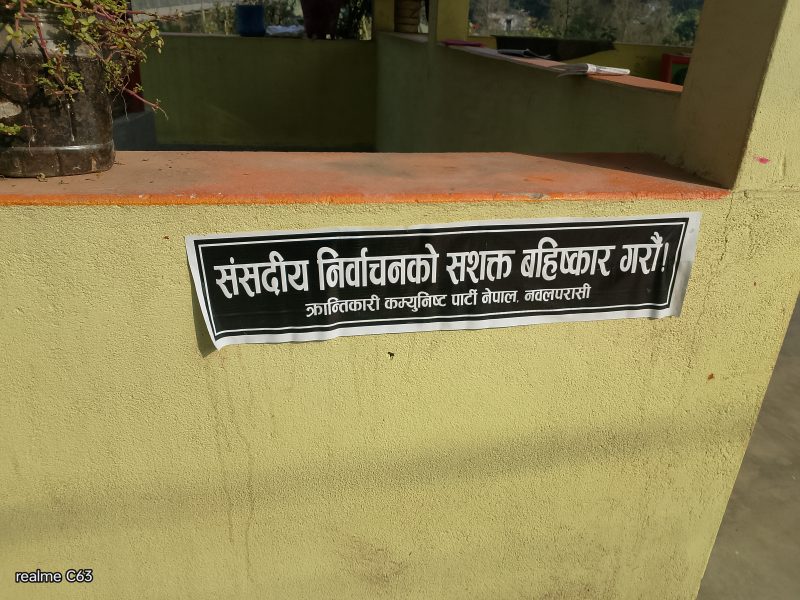 साम्राज्यवादद्वारा प्रायोजित निर्वाचनले राजनीतिक निकास दिन नसक्ने भएकोले उम्मेदवारहरुलाई सचेत बनाउन कालो झण्डा र ब्यानर राख्ने कार्यक्रम गरिएको सो पार्टीका बैकल्पिक केन्द्रीय सदस्य एवं जिल्ला सेक्रेटरी रवि पाण्डेयले जानकारी दिए । पार्टी केन्द्रको योजना अनुसार झण्डा राख्ने कार्यक्रमलगायत शान्तिपूर्ण बिरोध कार्यक्रम जारी रहने समेत उक्त पार्टीले जनाएको छ । जिल्लामा निर्वाचन बहिष्कार गर्ने चार दल सम्मीलित संयुक्त संघर्ष समिति, संयुक्त जेनजी समुहलगायत क्रियाशिल छन् । चुनावीमै सहभागी दलहरु बीच समेत अस्वस्थ्य प्रतिस्पर्धा र झगडाले निर्वाचनको शान्ति अमनचयनको अवस्था बारे जिल्लाबासीलाई थप चिन्तित बनाएको जानकारहरु बताउछ्न । जमुनियामा बिप्लव नेकपाका नेताहरु र दबिलामा एमाले कार्यकर्ता माथि रास्वपा कार्यकर्ताले कुटपिट गरेको भन्दै बिरोध जनाएपछि घटना सम्लग्न अजय गौतमलाई प्रहरीले नियन्त्रणमा लिएको छ ।