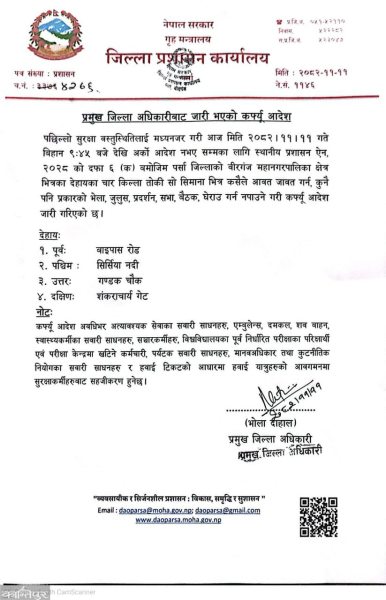 जिल्ला प्रशासन कार्यालय, पर्साले सोमबार आदेश जारी गर्दै कर्फ्यु लगाएको हो। दुई समुदायबीच विवाद बढ्दै गएपछि सुरक्षा वस्तुस्थितिलाई मध्यनजरगरि कर्फ्यु लगाइएको पर्साका प्रमुख जिल्ला अधिकारी भोला दाहालले जनाएका छन्।