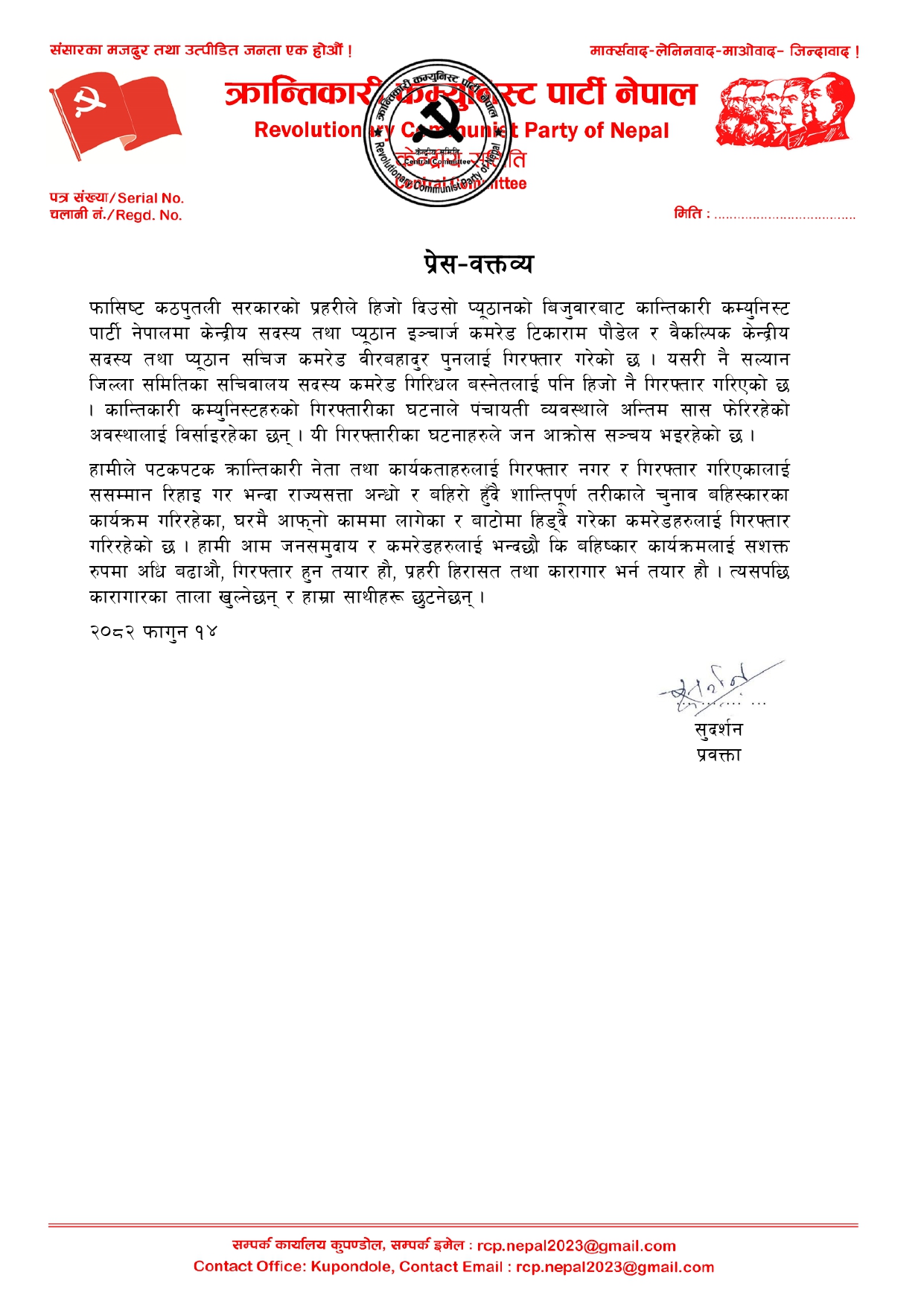 काठमाडौं । कान्तिकारी कम्युनिस्ट पार्टी नेपालका प्रवक्ता सुदर्शनले निर्वाचन बहिष्कार कार्यक्रमलाई सशक्त रुपमा अधि बढाउन आह्वान गर्नु भएको छ । कान्तिकारी कम्युनिस्ट पार्टी नेपालमा केन्द्रीय सदस्य तथा प्यूठान इञ्चार्ज टिकाराम पौडेल र वैकल्पिक केन्द्रीय सदस्य तथा प्यूठान सचिज वीरबहादुर पुन र सल्यान जिल्ला समितिका सचिवालय सदस्य गिरिधल बस्नेतलाई २०८२ फागुन १३ गते सुशीला कार्की नेतृत्वको सरकारले गिरफ्तार गरेको सन्दर्भमा प्रेस वक्तव्य जारी गर्दै सुदर्शनले सो आह्वान गर्नु भएको हो । २०८२ फागुन १४ गते प्रवक्ता सुदर्शनले जारी गरेको प्रेस वक्तव्य यस प्रकार छ –