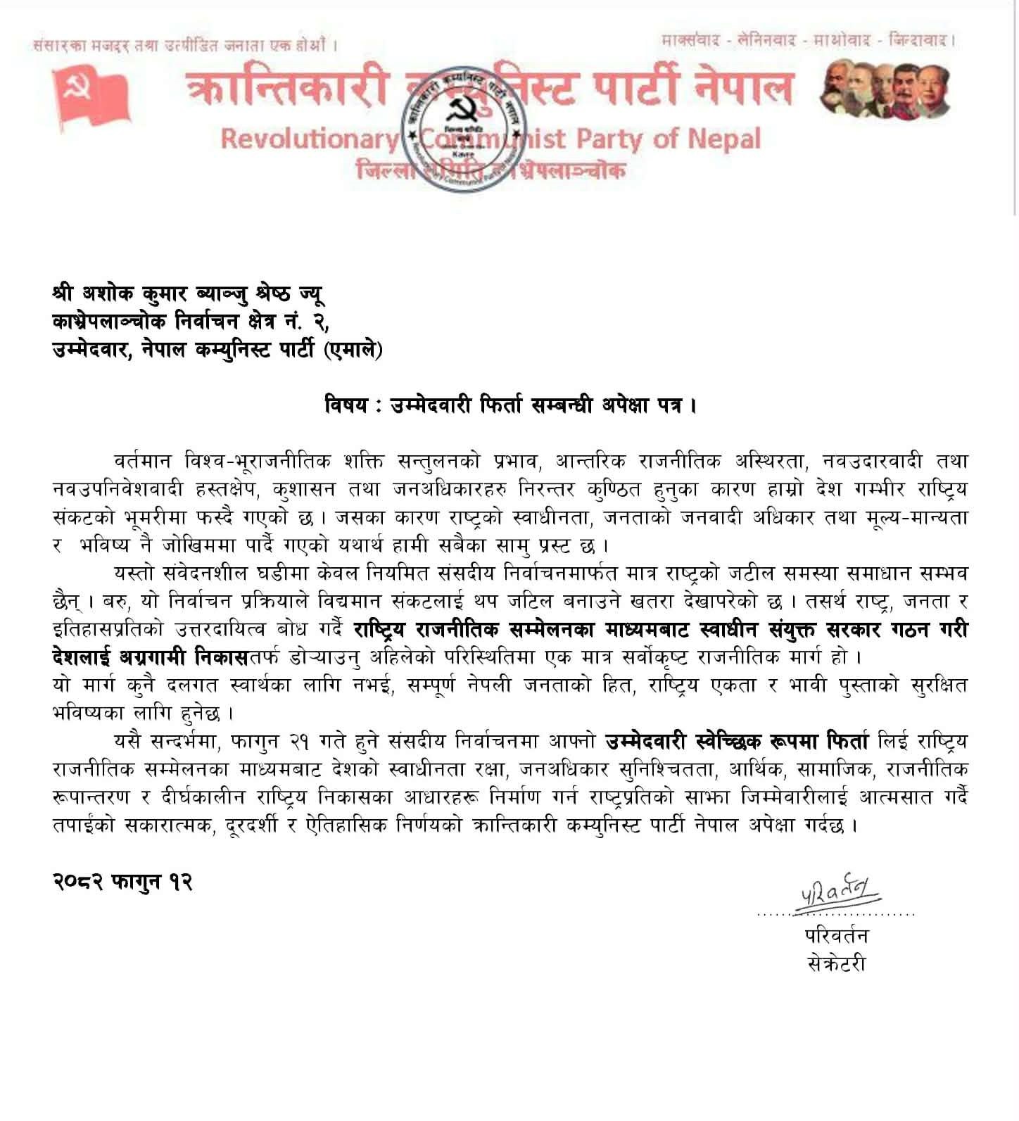 काठमाडौं । क्रान्तिकारी कम्युनिस्ट पार्टी नेपाल काभ्रेले फागुन २१ को संसदीय निर्वाचनमा उम्मेदवारी दिएकाहरुलाई उम्मेदवारी फिर्ता लिन आग्रह गर्दै पत्राचार गरेको छ । पार्टीका जिल्ला सेक्रेटरी परिवर्तनव्दारा हस्ताक्षेरित पत्रमा उम्मेदवारहरुलाई आफ्नो उम्मेदवारी फिर्ता लिन आग्रह गरिएको छ ।